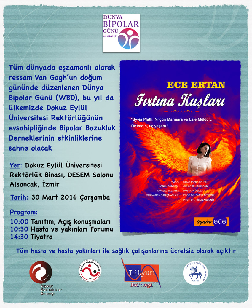 30 Mart Dünya Bipolar Günü kutlamaları için bu yıl İzmir deyiz. Katılmak isteyen herkese açık olan Forumda, geçtiğimiz yıl olduğu gibi, bu yıl da renkli ve sıcak paylaşımlara tanıklık etmeyi bekliyoruz. Ardından tiyatro sanatçısı Ece Ertanın rol aldığı tek kişilik oyun "Fırtına Kuşları"nı hep birlikte izleyeceğiz. Katılımınız bizlere güç verecektir. Hepinizi 30 Martta İzmire bekliyoruz. Ayrıntılı bilgi için buraya tıklayın